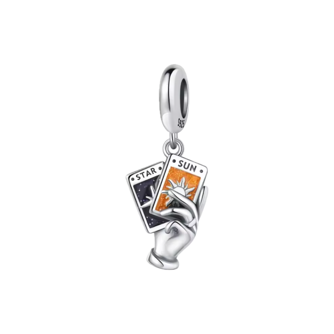Dieser magische Charm zeigt zwei detailverliebte Tarotkarten – „The Star“ und „The Sun“ – gehalten von einer silbernen Hand. Mit funkelnden Farben in Nachtblau und Sonnengold verleiht es deinem Armband eine geheimnisvolle Ausstrahlung.